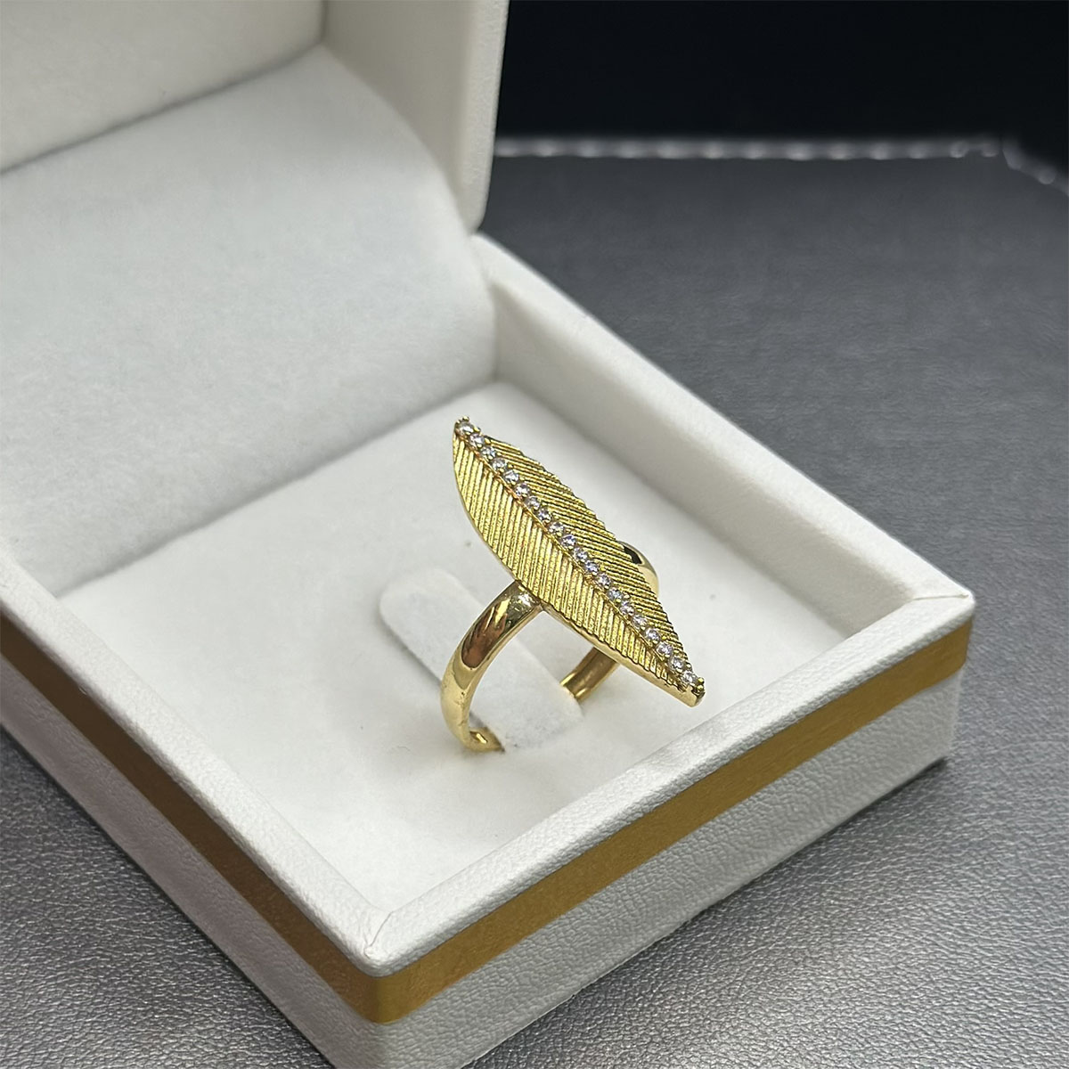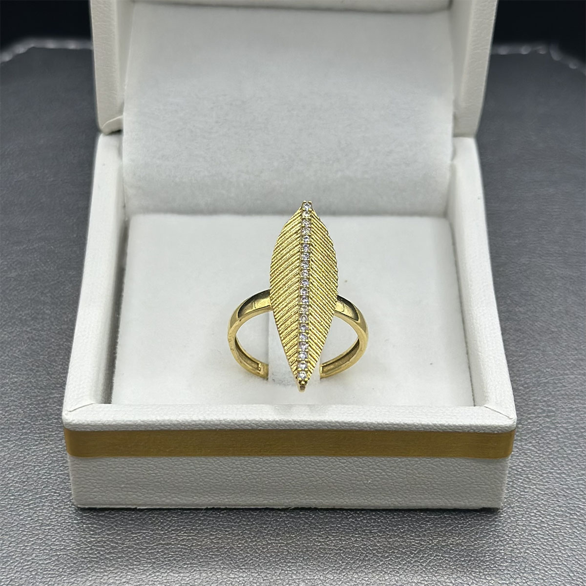 Bague en or jaune 18 carats, finement travaillée en forme de feuille délicate, symbole de renouveau et de légèreté.